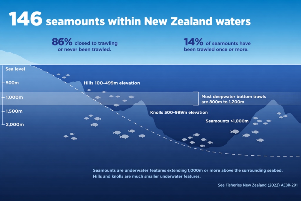 The number of seamounts we trawl is also very limited. Of the 146 known seamounts in our ocean territory only 20 have been trawled once or more. 125 seamounts are closed to trawling or have never been trawled.